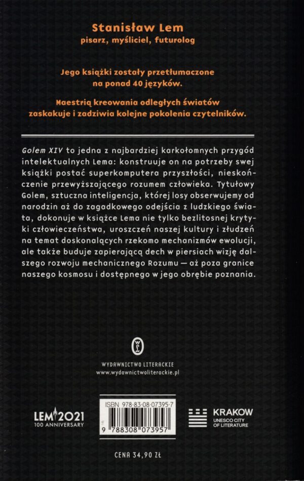 W Golemie XIV Stanisław Lem proponuje czytelnikowi jedną z najbardziej niezwykłych i odważnych literackich przygód. Konstruuje on Golema – obdarzony świadomością super komputer – przewyższający inteligencją człowieka, który wygłasza przed naukowcami wykłady. Jednak stworzona przez ludzką chęć panowania nad wszystkim, co istnieje, sztuczna inteligencja, zaskakuje swoich konstruktorów. Komputer, a tym samym Lem, bezlitośnie krytykuje człowieczeństwo, stworzoną przez homo sapiens kulturę oraz złudzenia na temat mechanizmów ewolucji. Golem kreśli oszałamiającą wizję rozwoju sztucznej inteligencji, która może ostatecznie przekroczyć granice kosmosu i ludziom rozumowania. Lem, próbując oddać myśli superkomputera, stwarza na oczach czytelników dialog ludzkości i ludzkiego rozumu z „nieludzkością” i Rozumem, który przekracza już nasze możliwości poznania. Czy ta wizja Lema – w świecie rządzonym coraz bardziej przez algorytmy – okaże się prorocza?