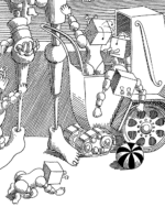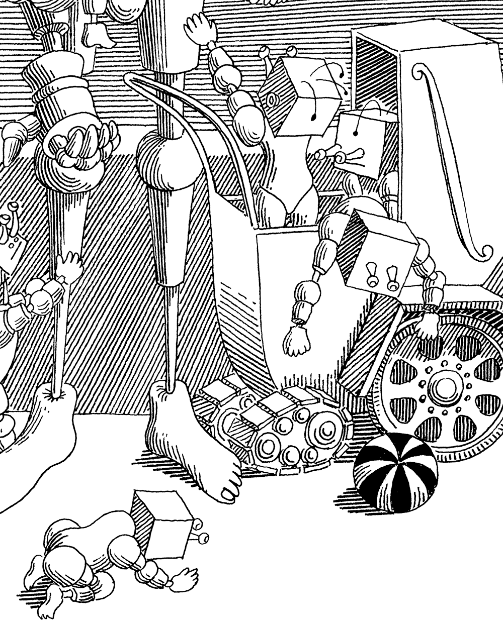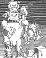 Ilustracja do opowiadania “Wyprawa czwarta, czyli o tym, jak Trurl kobietron zastosował, królewicza Pantarktyka od mąk miłosnych chcąc zbawić, i jak potem do użycia dzieciomiotu przyszło” z Cyberiady Stanisława Lema. Trurl pomaga królowi Protudynowi wygrać wojnę dzięki użyciu dzieciomiotu.