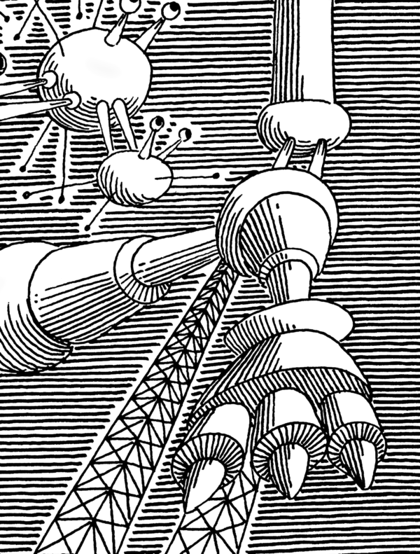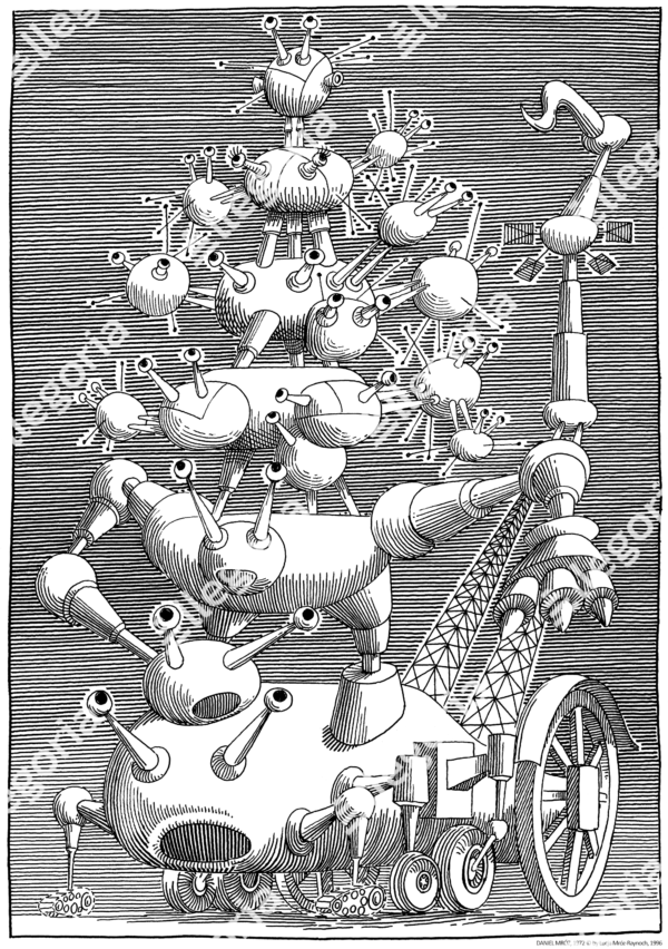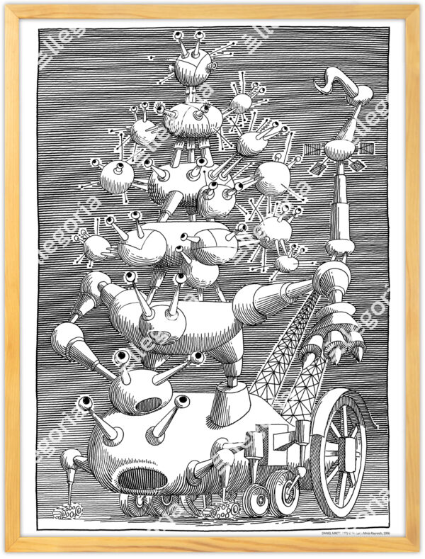 Ilustracja Daniela Mroza do opowiadania “Wyprawa druga, czyli oferta króla Okrucyusza” z Cyberiady Stanisława Lema. Potwór, którego Trurl i Klapaucjusz mieli skonstruować na zamówienie króla Okrucyusza, zapalonego myśliwego. Jak zawsze konstruktorzy zapłaciliby głową w wypadku niepowodzenia.