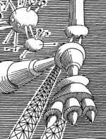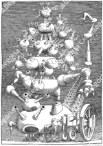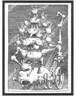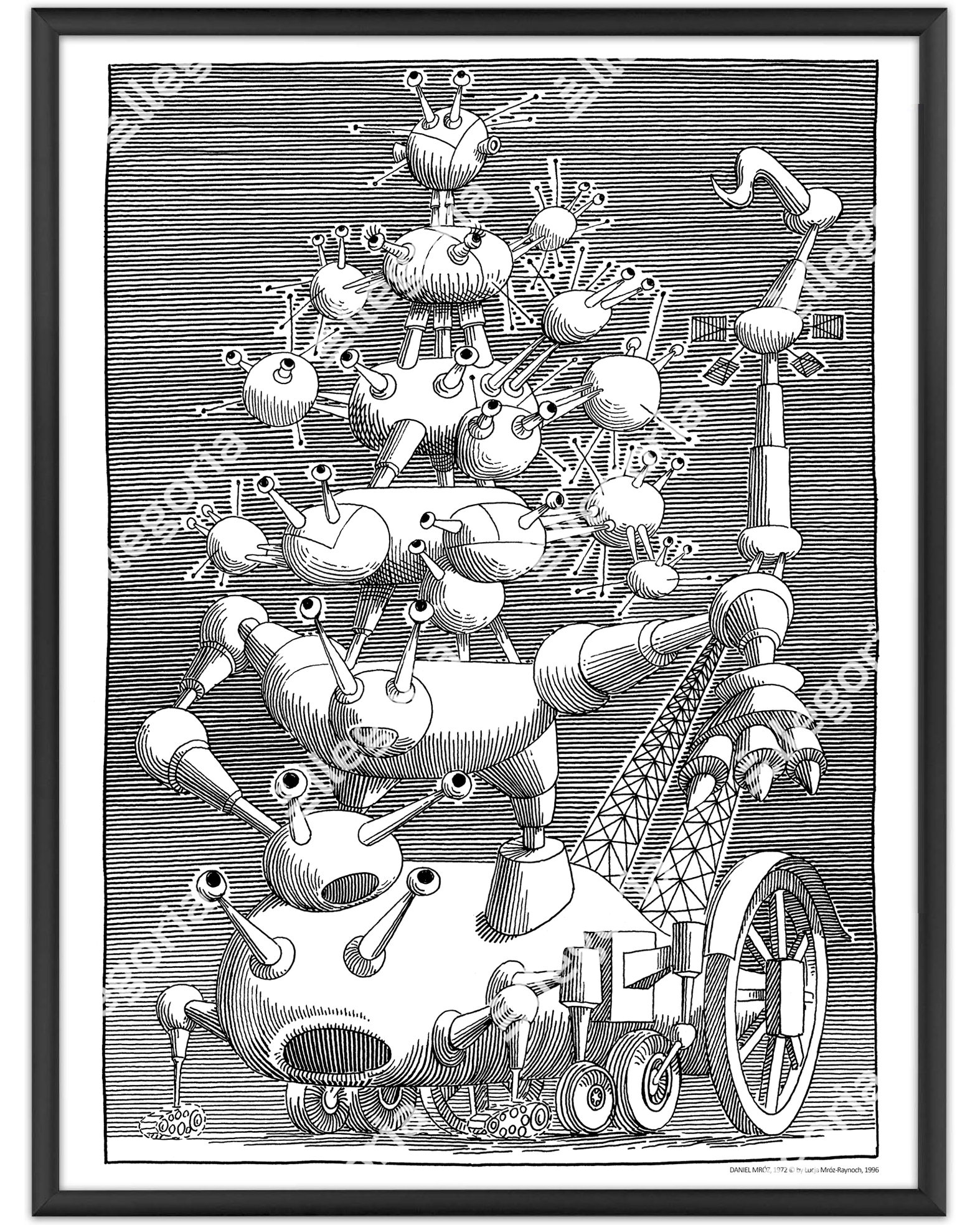 Ilustracja Daniela Mroza do opowiadania “Wyprawa druga, czyli oferta króla Okrucyusza” z Cyberiady Stanisława Lema. Potwór, którego Trurl i Klapaucjusz mieli skonstruować na zamówienie króla Okrucyusza, zapalonego myśliwego. Jak zawsze konstruktorzy zapłaciliby głową w wypadku niepowodzenia.