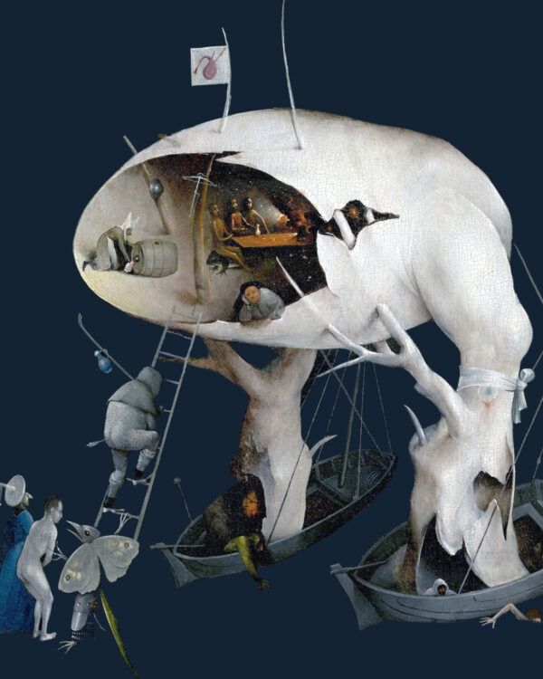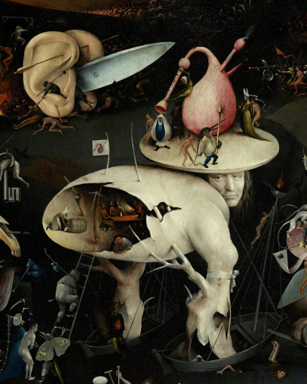 Wydaje się, że to dziwne stworzenie ma ludzką twarz i pochyla się do przodu. Podparte nogami przypominającymi odwrócone głowy jelenia, przebite własnymi rogami, podobnymi do pni drzew, z których wystają gałęzie. Człowiek Drzewo balansuje na dwóch małych łódkach, w których grupa ludzi próbuje znaleźć schronienie. W tawernie wewnątrz torsu Tree Mana kobieta wyciąga kufle z beczki i widzimy kuszę – narzędzie Szatana – zwisającą z drzewa. Mężczyzna siedzi na gigantycznej ropusze, symbolu diabła.