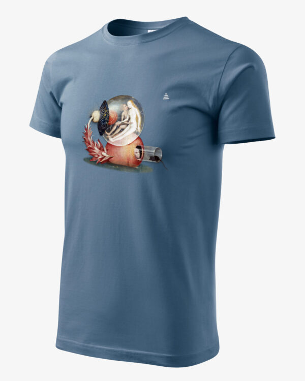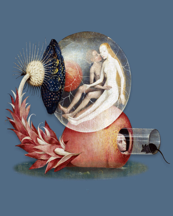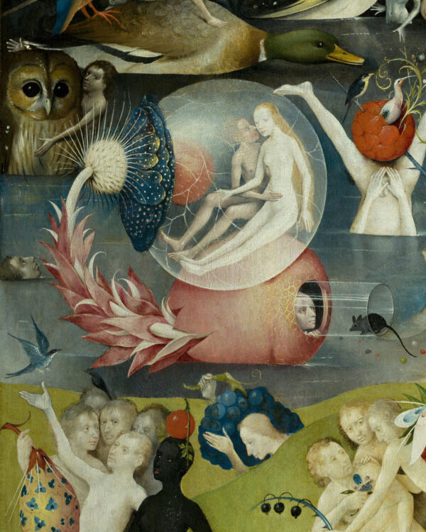 Tuż obok sowy widzimy mężczyznę i kobietę zamkniętą w szklanej kuli. Kula jest przymocowana do dużego kwiatu, który z kolei wyrasta z różowej kuli unoszącej się na wodzie pod parą. Mężczyzna położył jedną rękę na brzuchu kobiety, patrząc na nią wygłodniałymi oczami. Kobieta położyła jedną rękę na jego udzie. Podobnie jak wiele innych szczegółów panelu centralnego, jest to wyraźne odniesienie do seksualności i pożądania. Można to postrzegać jako wariację Boscha na temat małych łódek, przedstawionych w późnośredniowiecznych księgach, w których zalotnicy wyznają sobie miłość. Kula oddziela tę dwójkę od pozostałych postaci, ale widzimy też pojawiające się małe pęknięcia. Znowu czai się niebezpieczeństwo, może nawet większe, ponieważ postacie w środku mają zamiar poddać się uczuciu pożądania.