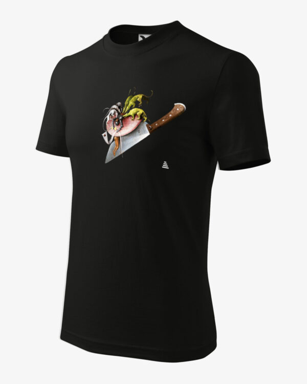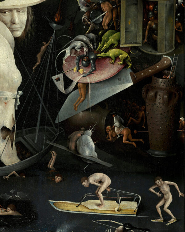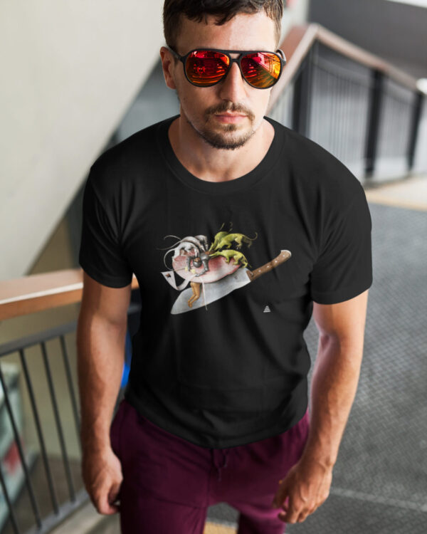 Na dużym okrągłym dysku leży rycerz, obezwładniony i rozszarpywany na kawałki przez potworne drapieżniki. W dłoni trzyma kielich, obok którego widzimy opłatek – wyraźne nawiązanie do liturgii chrześcijańskiej, z chlebem i winem symbolizującymi odpowiednio Ciało i Krew Chrystusa. Całość osadzona jest na ostrzu noża, sygnowanym charakterystycznym znakiem firmowym rodzinnego miasta malarza, ’s-Hertogenbosch.