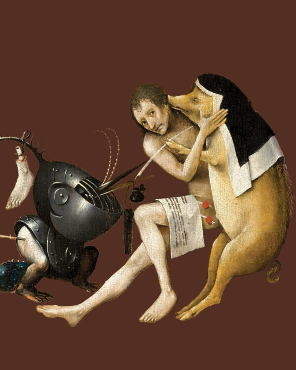 To wyglądało na niewinną czarną pleśń na życie. Jednak wówczas nikt nie wiedział, że ten “grzyb sporyszu” był przyczyną “gnijącej choroby” lub gangreny, która powodowała, że kończyny sinieją. Bosch maluje odciętą stopę, aby przypomnieć nam historię ergotyzmu, czasami nazywanego ogniem św. Antoniego, będącego efektem efekt zatrucia alkaloidami sporyszu. Jeśli zjadłeś chleb od niewłaściwego piekarza, na Twoim ciele pojawiały się owrzodzenia, a ostatecznie noga stawała się czarna i odpadała. Chirurg mógł bezskutecznie próbować uratować Twoje życie, odcinając zmienioną chorobą kończynę. Po spożyciu trującego sporyszu, kończyny gniją, a umysł jest mętny od halucynacji, co ostatecznie prowadzi do obłędu.