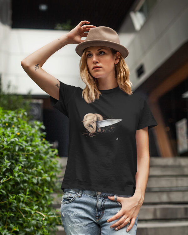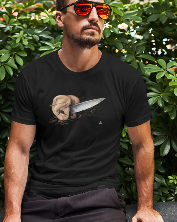 W czasach Boscha noże były używane zarówno jako narzędzia, jak i w walce. Ostrze posiada oznaczenie, który wygląda jak litera „B” lub „M” odwrócona na bok. Ten szczególny symbol, który powraca w pracach Boscha, odwołuje się do rodzinnego miasta malarza. W XV i XVI wieku w Hertogenbosch kwitł przemysł nożowy o międzynarodowej renomie. Jego produkty eksportowano aż do Hiszpanii i Skandynawii. W mieście podczas wykopalisk archeologicznych znaleziono noże z tym samym symbolem. Na obrazie widzimy narzędzie, które było używane do obierania ziemniaków, ale mogło również służyć do obcinania uszu złodziejom. Drastyczne kary cielesne w tamtych czasach były dość powszechne, a obcinanie uszu było zarezerwowane dla niepoprawnych kleptomanów.