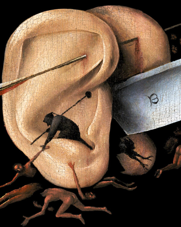 Grupa zagubionych dusz jest miażdżona przez parę ogromnych uszu z wbitym pomiędzy nie nożem. Armia maszeruje w kierunku przerośniętego urządzenia. Złowrogo wyglądające uszy przypominają machinę wojenną, ale niewątpliwe jest również podobieństwo do męskiego organu płciowego. Uszy zostały przebite strzałą, z której sączy się krew.