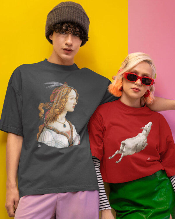 Wprowadź odrobinę beztroski i humoru do swojej codziennej garderoby w towarzystwie szczęśliwej owcy, która najwyraźniej dąży do transcendencji. Projekt łączy prostotę i lekkość, idealnie nadając się na różne okazje: sporo osób bierze w tej koszulce śluby i chodzi na pogrzeby.