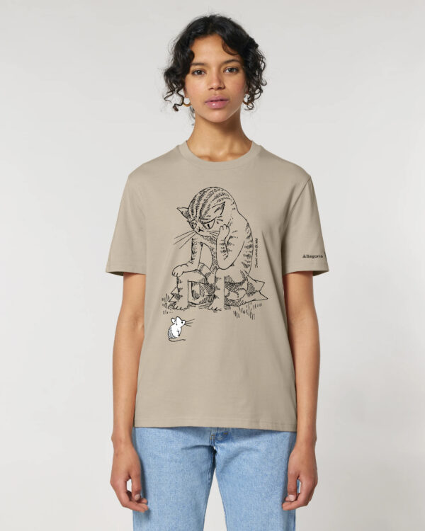 Ilustracja przedstawia zadumanego kota w filozoficznej pozie, siedzącego na kamieniu i wpatrzonego w niewielką mysz. Obraz pełen jest charakterystycznego dla Mroza humoru, detalu i refleksji nad relacją między światem ludzi a zwierząt. Ta koszulka to nie tylko artystyczny hołd dla jego twórczości, ale również wyraz miłości do zwierząt i sztuki.