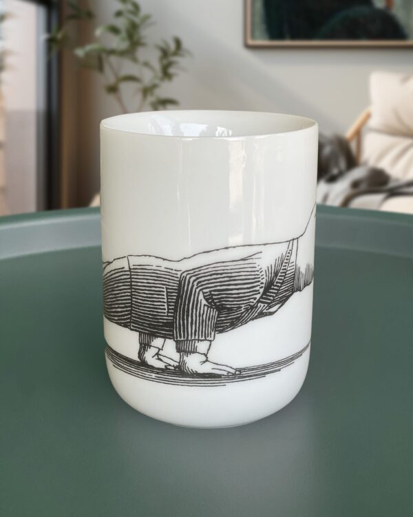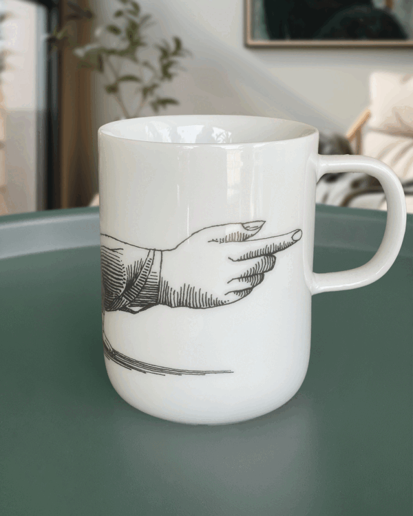 Kubek wykonany został ze szlachetnej białej, cienkościennej, transparentnej porcelany premium. Grafika nadrukowana wokół kubka, co w połączeniu z wzorem rączki-strzałki, daje ciekawy efekt.