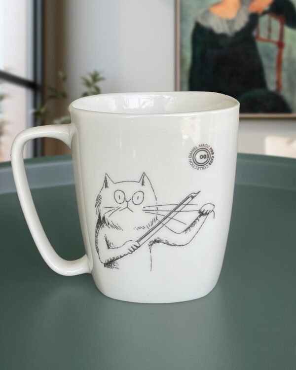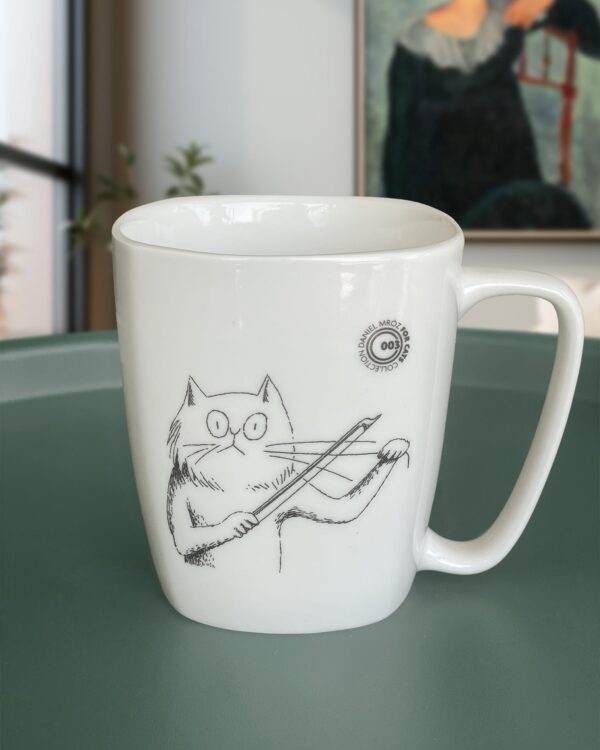Specjalnie dla wielbicieli mruczków. Wyjątkowy kubek z kolekcji DANIEL MRÓZ FOR CATS, sygnowany numerem 003. Dwie ścianki ozdobione unikatową grafiką, przedstawiającą Kota Muzykanta. Kolekcja złożona z czterech wzorów. Każdy wzór opatrzony specjalnym logotypem z numerem.