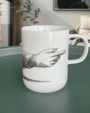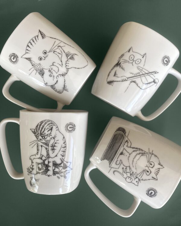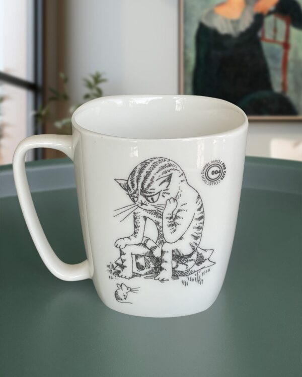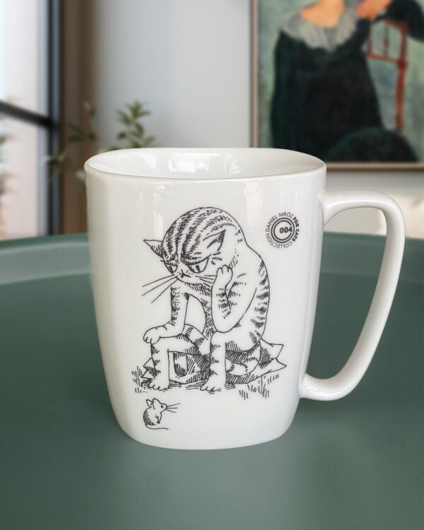Specjalnie dla wielbicieli mruczków. Wyjątkowy kubek z kolekcji DANIEL MRÓZ FOR CATS, sygnowany numerem 004. Dwie ścianki ozdobione unikatową grafiką, przedstawiającą Kota Myśliciela. Kolekcja złożona z czterech wzorów. Każdy wzór opatrzony specjalnym logotypem z numerem.