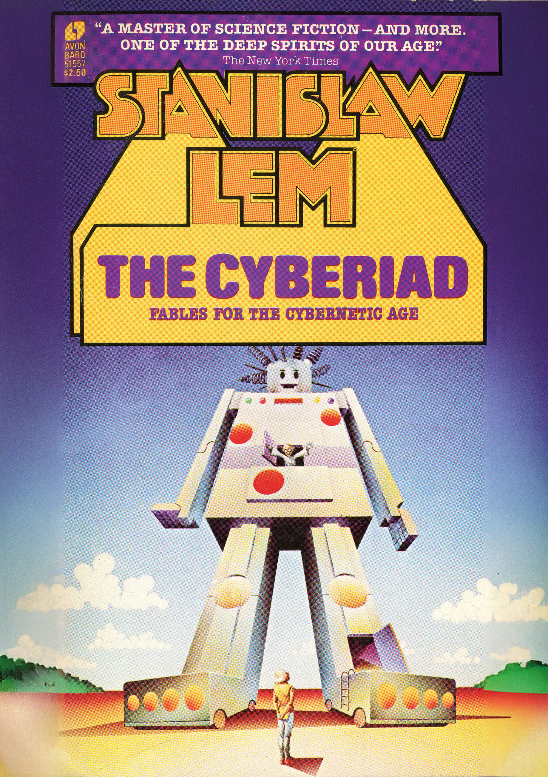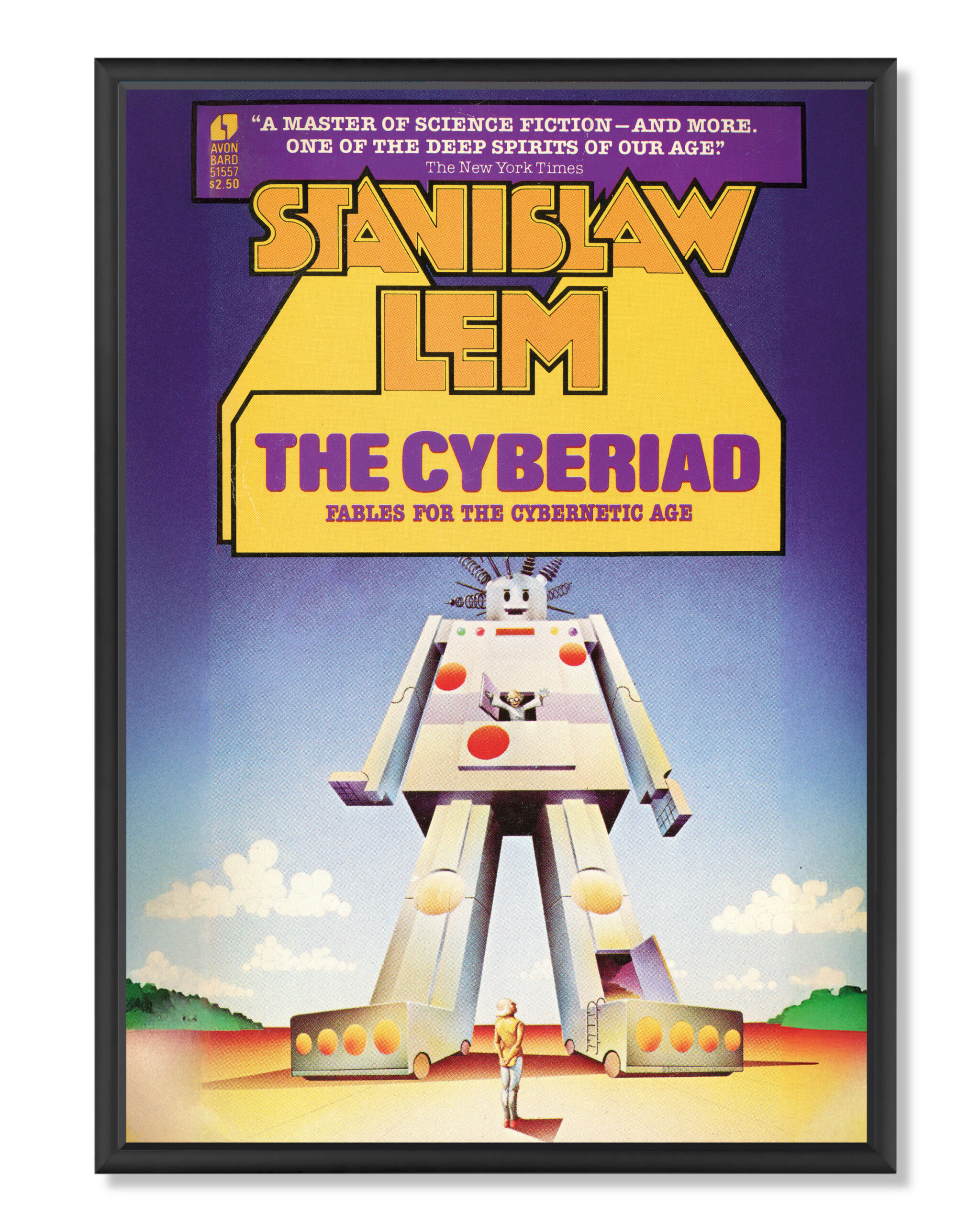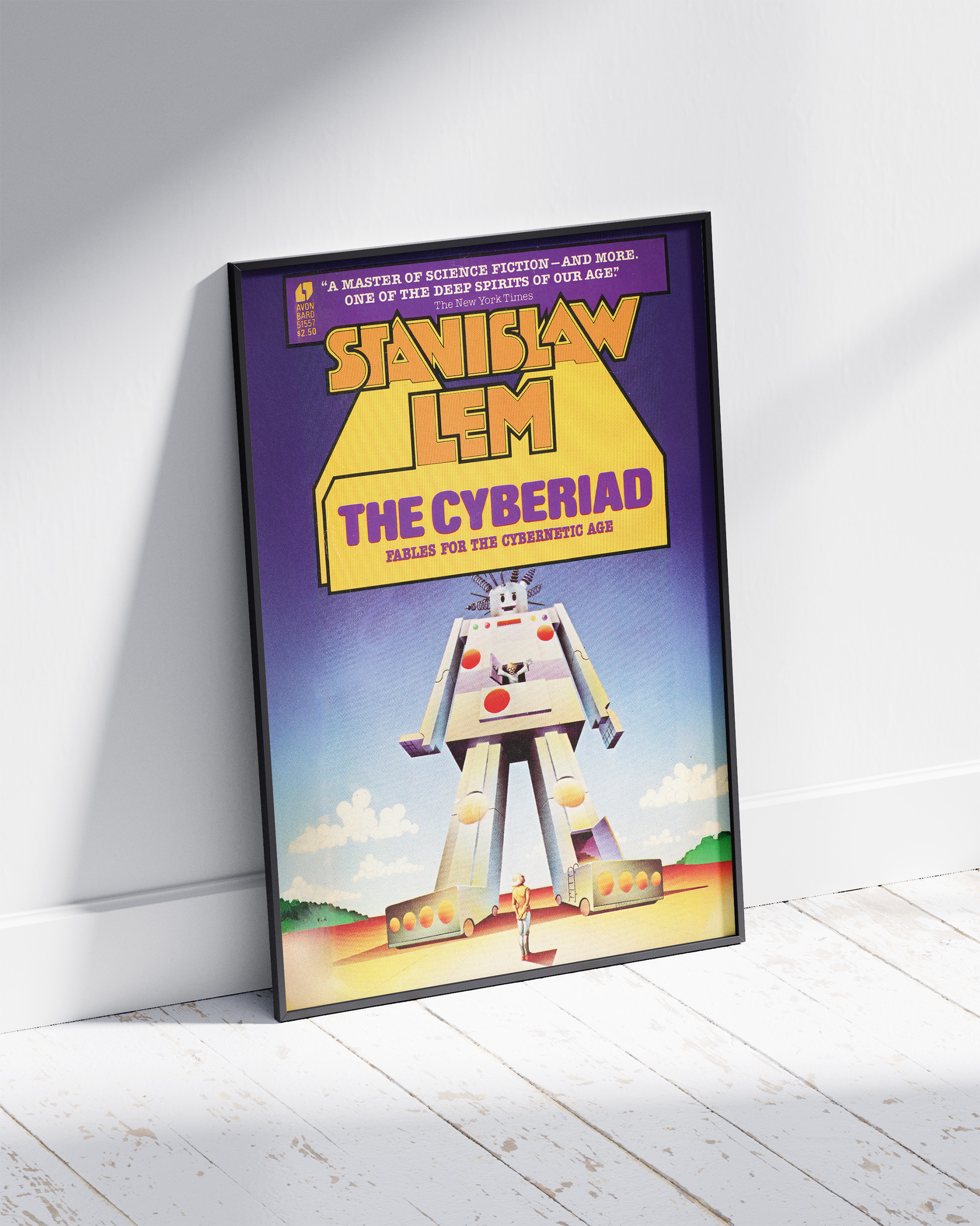 Plakat z okładką angielskiego wydania “Cyberiady” z 1976 roku. Wydruk cyfrowy na grubym matowym papierze niepowlekanym 350 g o wysokiej archiwalnej jakości, zapewniającym intensywne kolory.