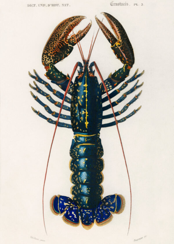 Grafika przedstawia homara zwyczajnego (Homarus gammarus) w formie nadzwyczajnej: precyzyjnej ilustracji naukowej pochodzącej z XIX-wiecznych francuskich atlasów historii naturalnej. To przykład dawnej grafiki, w której dokładność biologiczna łączy się z wysoką kulturą edytorską – charakterystyczną dla epoki sprzed fotografii.