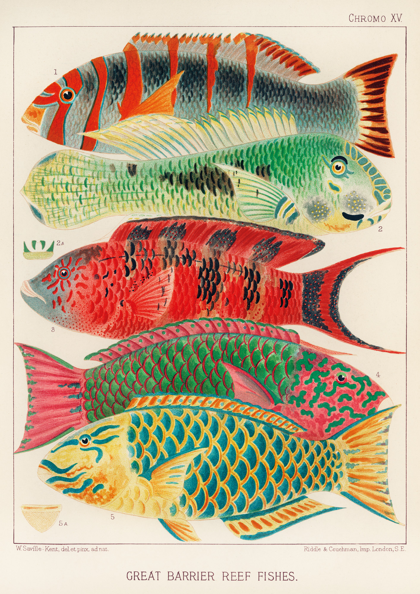 Ilustracja przedstawia ryby zamieszkujące Wielką Rafę Koralową, zaczerpnięte z publikacji Williama Saville-Kenta z 1893 roku, zatytułowanej The Great Barrier Reef of Australia. To jedna z serii barwnych tablic, które miały pokazać bogactwo życia morskiego w sposób możliwie czytelny i dokładny.