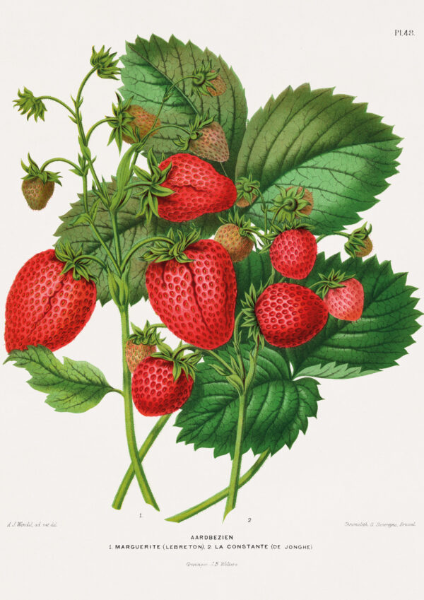 ilustracja botaniczna truskawek pochodząca z XIX wieku, znana pod tytułem „Aardbezien” – czyli po prostu „truskawki” w języku niderlandzkim. Rycina została opublikowana w dawnym atlasie przyrodniczym Nederlandsche flora en pomona.