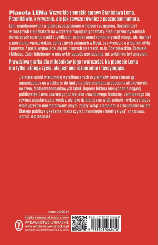 Planeta LEMa to felietony najlepsze i ponadczasowe, dodatkowo błyskotliwie napisane. Czytelników zainteresowanych historią i polityką zaintrygują zaskakujące, idące pod prąd komentarze Stanisława Lema. Miłośnicy literatury odnajdą z kolei w felietonach wiele arcyciekawych interpretacji. Nie mogło w nich zabraknąć i tego, z czym przede wszystkim pisarza kojarzymy – futurologii. Prorokował komputeryzację mózgu, autonomiczne samochody, przewidywał kierunki rozwoju nauki i cywilizacji. Dlatego są to felietony ponadczasowe, stanowiące podsumowanie dorobku autora i uporządkowanie wiedzy o jego twórczości.